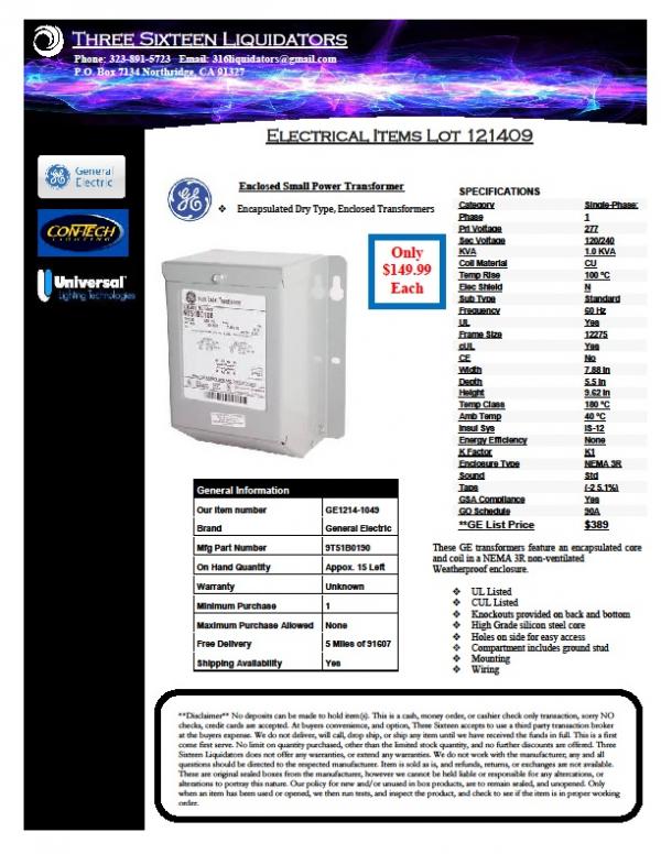 We recenlty purchased of a Lot, and enclosed was 12 GE Transformers Single Phase. We are extremely motivated to sell them! Please feel free to contact me if you have any questions, and hope to hear from you soon, All The Best, Gary 323-891-5723